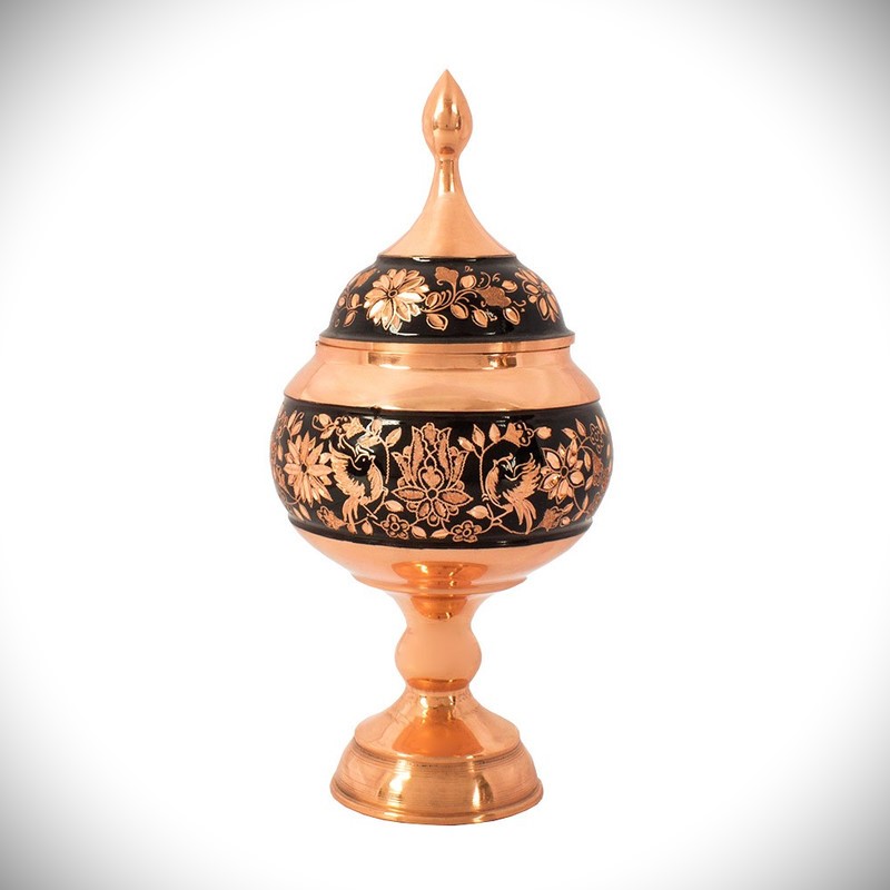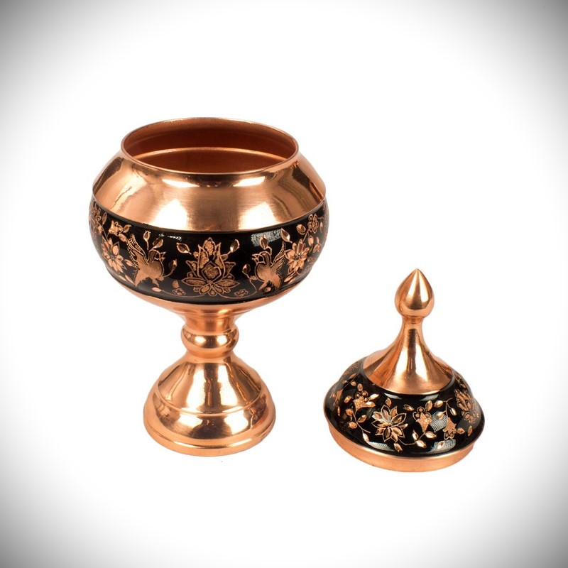 از این شکلات خوری مسی حکاکی درب دار نه تنها برای تزیین، بلکه برای پذیرایی شکلات،قند، آجیل و… می توان استفاده کردحکاکی و پرداز یک نوآوری در زمینه صنایع دستی می باشد که قسمتی از بدنه مسی محصول، حکاکی شده و جلوه زیبایی به آن می بخشد. جنس بدنه این ظروف از فلز مس است. ب