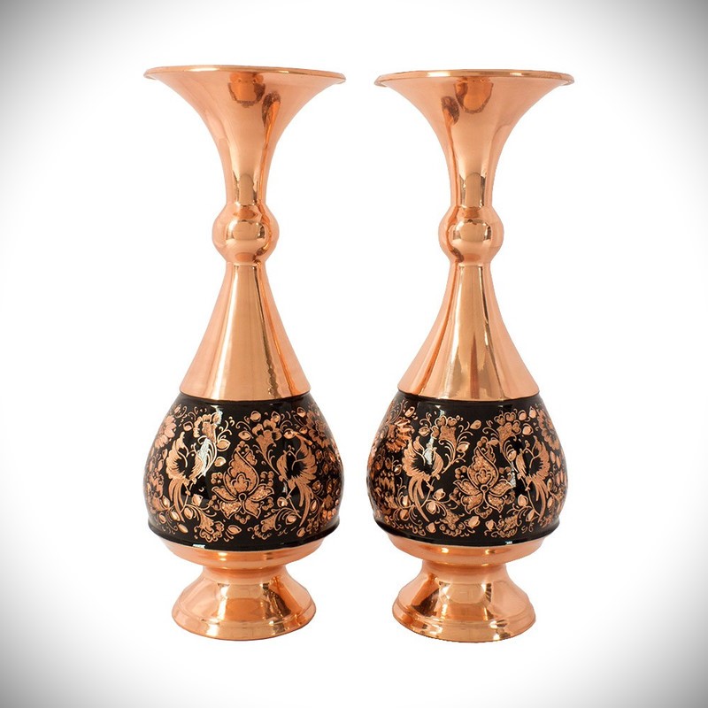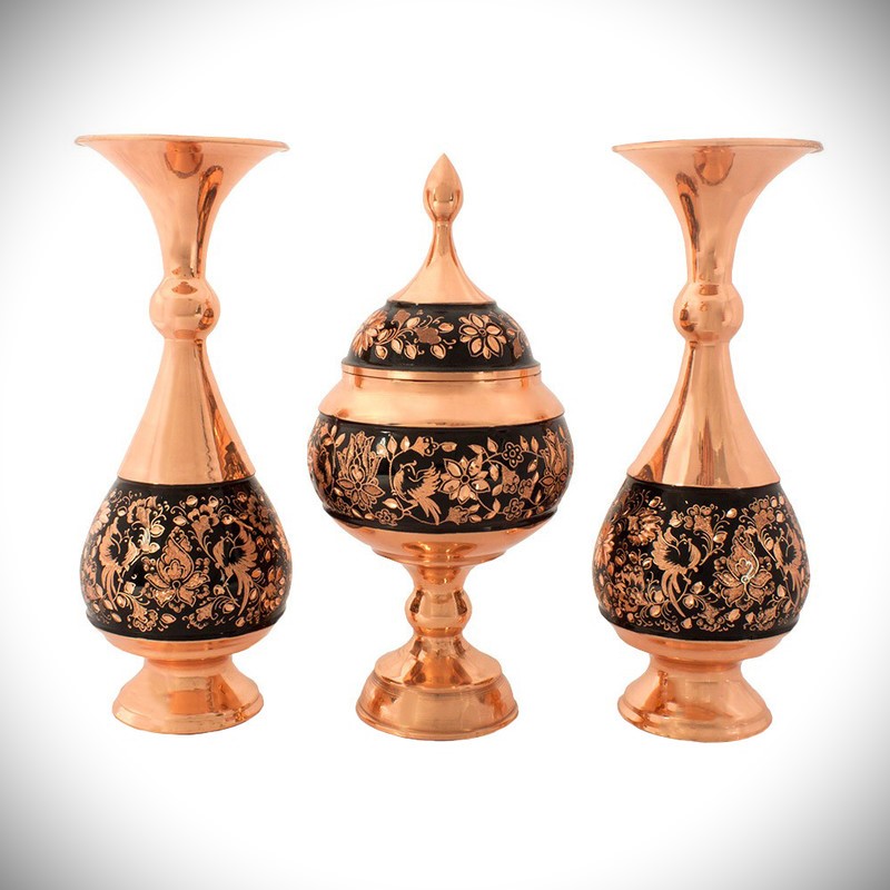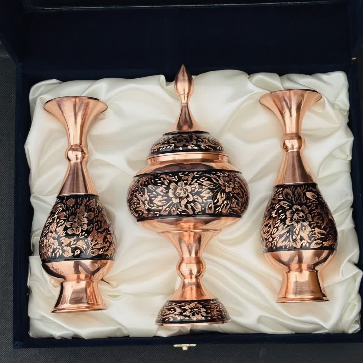 این مجموعه شامل دو گلدان و یک شکلات خوری به همراه جعبه کادویی مخمل است. همنشینی گل و مرغ های ظریف حکاکی شده با سمبه دستی در کنار رنگ زیبا و گرم مسی باعث چشم نوازی این ست نفیس صنایع دستی شده است.