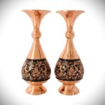 این جفت گلدان مسی با نقوش حکاکی گل و مرغ، علاوه بر زینت دادن ویترین خانه ی شما با صنایع دستی اصیل ایرانی ،محل مناسبی برای نگهداری از شاخه گل های طبیعی بر روی میز میباشد. سطح خارجی شکلات خوری توپی شکل سرشار از نقش های گل و مرغ حکاکی زیباست. تناسب و رعایت تعادل در استفاده از رنگهای تیره و روشن و درب دار بودن ظرف یک اثر متفاوت و نفیس پدید آوره است.