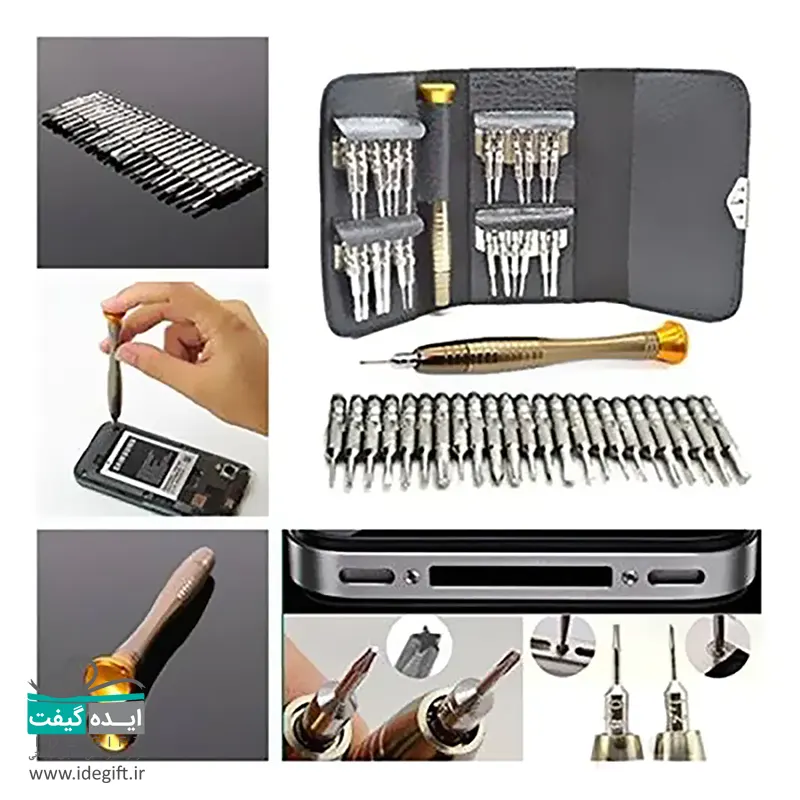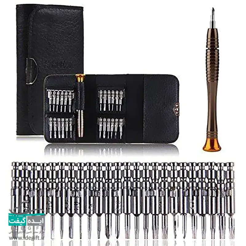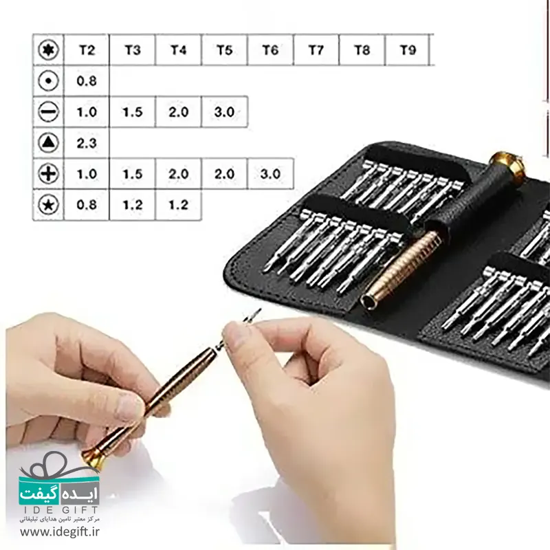 دارای ۱۰ عدد سری شش پر با سایزهای T۲ T۳ T۴ T۵ T۶ T۷ T۸ T۹ T۱۰ T۱۵ – دارای ۱ عدد سری لوله ای با سایز ۰.۸ – دارای ۲ عدد سری ستارهای با سایزهای ۰.۸ ۱.۲ – دارای ۱ عدد سری مثلثی با سایز ۲.۳ – دارای ۱ عدد سری وای با سایز ۲.۰ – دارای ۵ عدد سری چهارسو با سایزهای ۱.۰ ۱.۲ ۱.۵ ۲.۰ ۳.۰ – دارای ۴ عدد سری دوسو با سایزهای ۱.۰ ۱.۵ ۲.۰ ۳.۰ – دارای ۱ عدد دسته پیچ گوشتی با طول ۱۰ سانتیمتر دارای یک عدد کیف