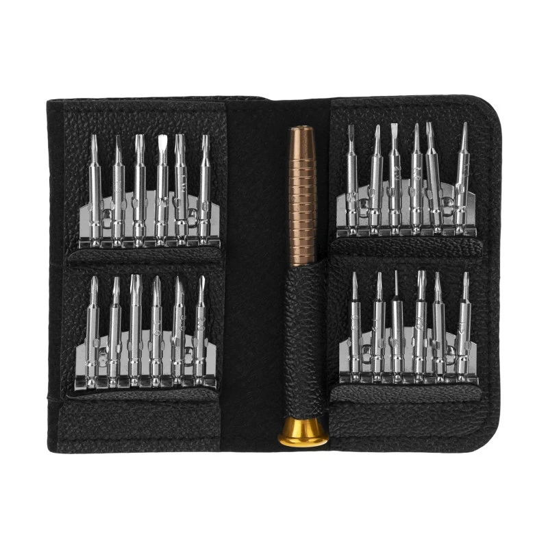 توضیحات تعداد : دارای ۱۰ عدد سری شش پر با سایزهای T۲ T۳ T۴ T۵ T۶ T۷ T۸ T۹ T۱۰ T۱۵ – دارای ۱ عدد سری لوله ای با سایز ۰.۸ – دارای ۲ عدد سری ستارهای با سایزهای ۰.۸ ۱.۲ – دارای ۱ عدد سری مثلثی با سایز ۲.۳ – دارای ۱ عدد سری وای با سایز ۲.۰ – دارای ۵ عدد سری چهارسو با سایزهای ۱.۰ ۱.۲ ۱.۵ ۲.۰ ۳.۰ – دارای ۴ عدد سری دوسو با سایزهای ۱.۰ ۱.۵ ۲.۰ ۳.۰ – دارای ۱ عدد دسته پیچ گوشتی با طول ۱۰ سانتیمتر دارای یک عدد کیف