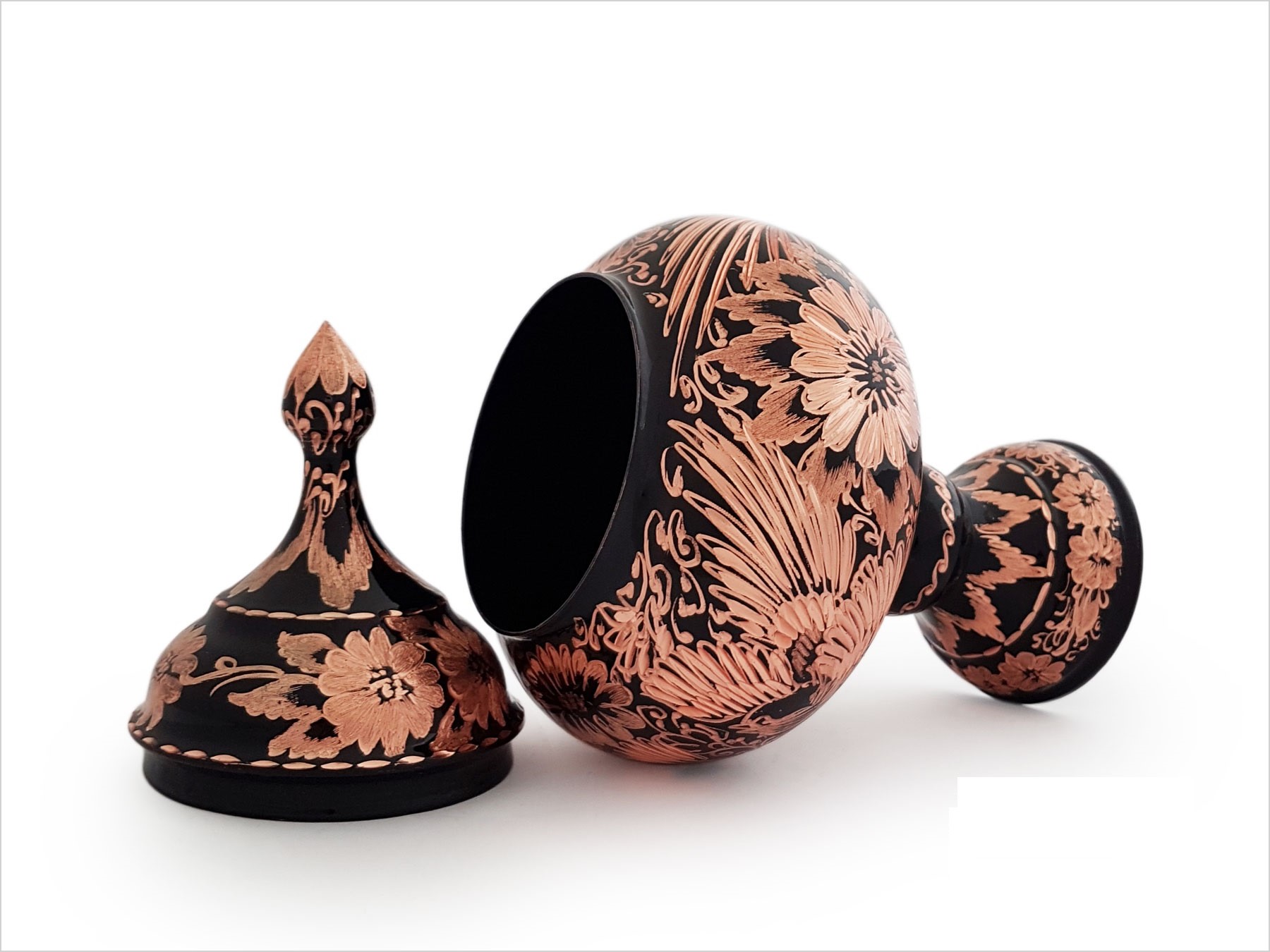 در مرحلهی بعد لبهی خارجی ظروف به دست هنرمندان زبردست، شبکهبری میشود. سپس سطح خارجی محصول را با رنگ سیاه میپوشانند.