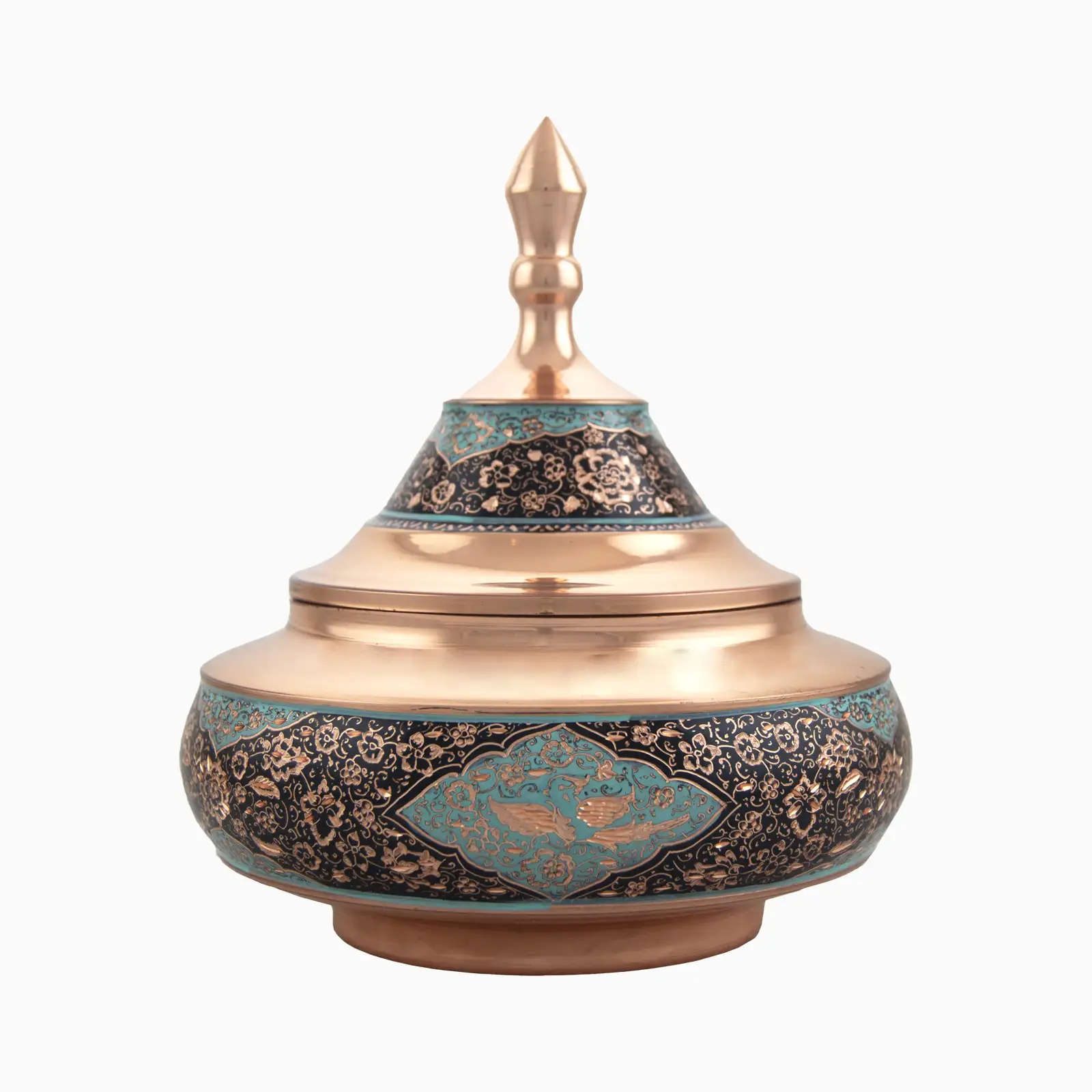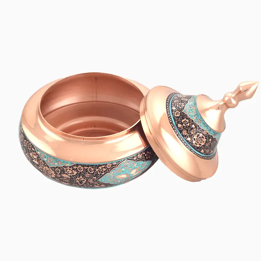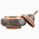قندان الماستراش ، یکی از آثار فاخر هنر ایرانی است که با ترکیب سه رنگ چشمنواز آبی فیروزهای، مشکی و مسی جلوهای منحصربهفرد ایجاد کرده است. این قندان همواره نماد ظرافت، دقت و اصالت در کارهای دستی است و با طراحی گل و بته ایرانی، زیبایی سنتی را در نهایت هماهنگی به نمایش میگذارد.
