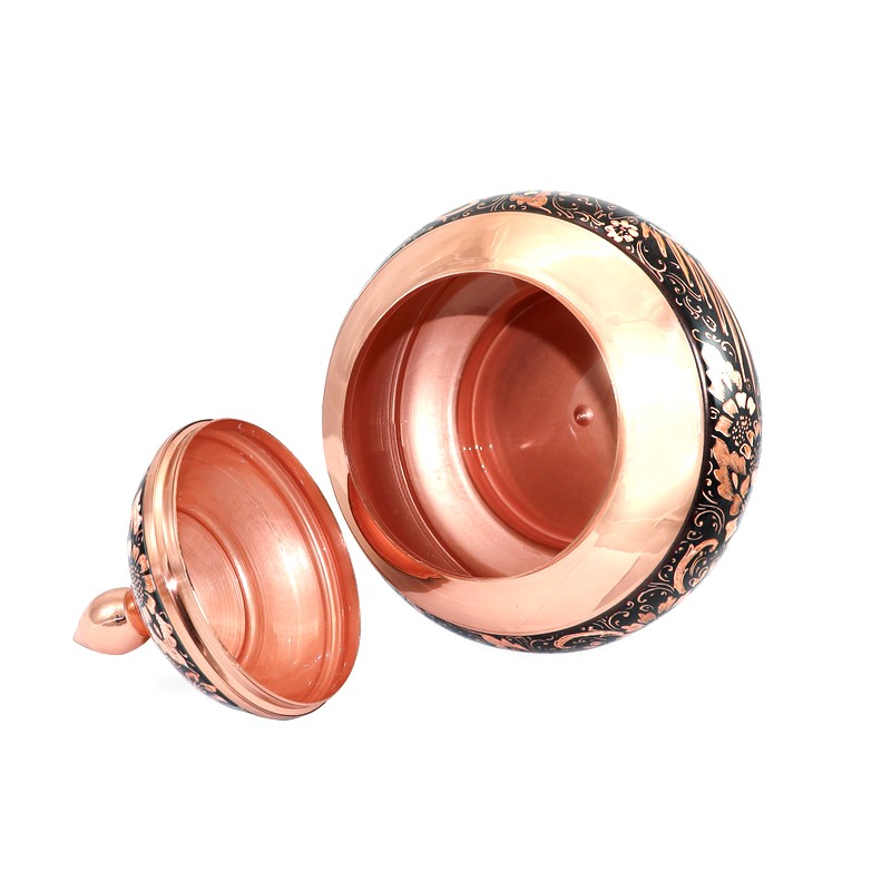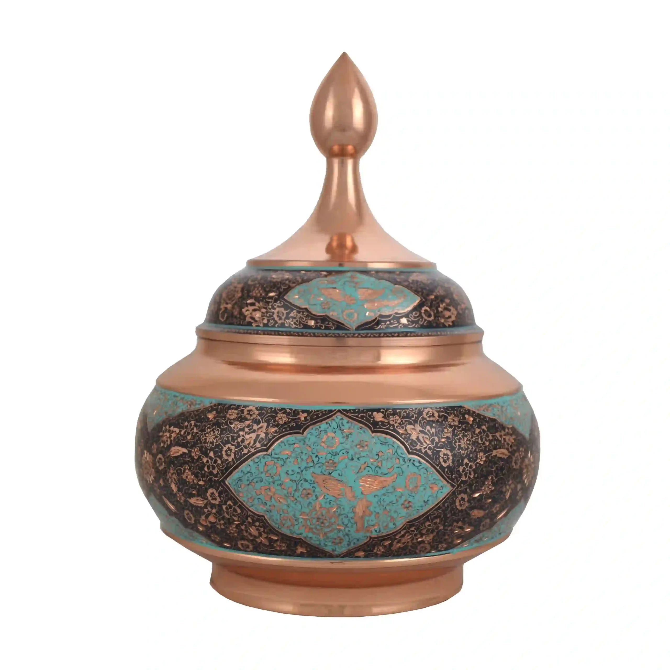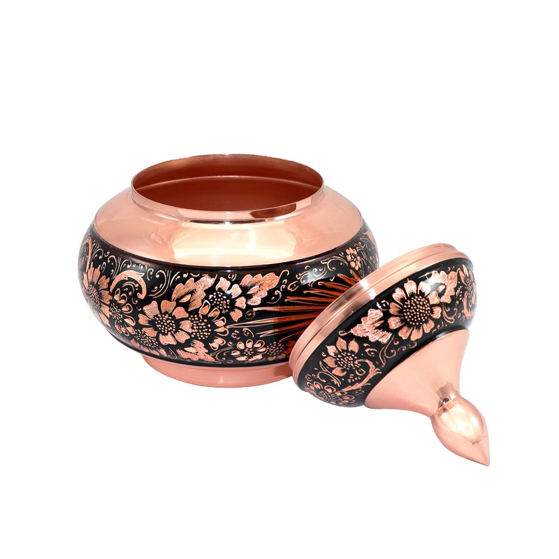 ین قندان مس و الماس تراش زیبا توانسته بسیار هنرمندانه تصاویری از طبیعت و گل مرغ را به نمایش بگذارد. این تصاویر را می توان هم بر روی بدنه و هم درب این قندان مشاهده کرد. این قندان در سایزها و ارتفاع مختلف قابل عرضه می باشد.